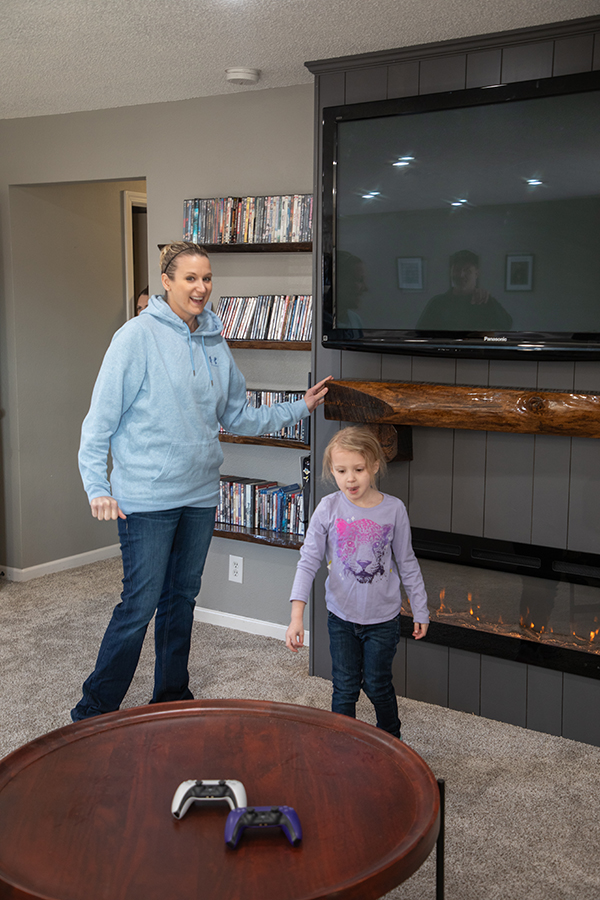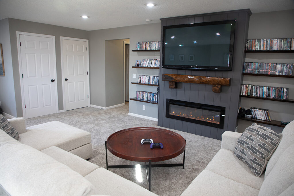 To bring warmth (both literal and visual) to the space, we constructed a custom electric fireplace enclosure. This serves as the heart of the new family room. Vertical shiplap paneling adds height to the standard ceiling and Sherwin Williams Gallery paint in peppercorn brings weight and durability to this focal point.