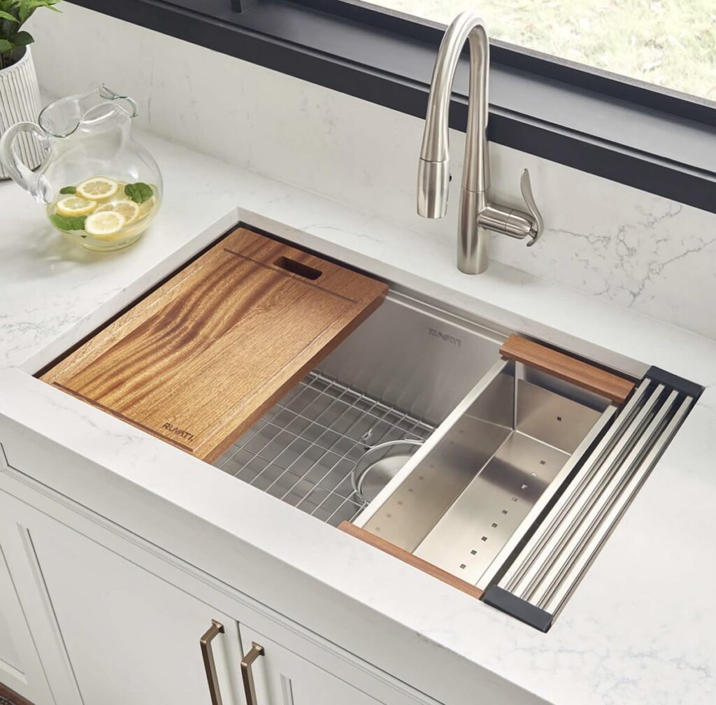 - The Workstation Sink: The sink has evolved into a “prep hub.” Models like the Kohler Synthos include integrated cutting boards, colanders, and drying racks that slide along built-in tiers. Top-tier, American-made faucets from Phylrich add durability and timeless style.